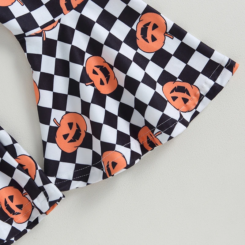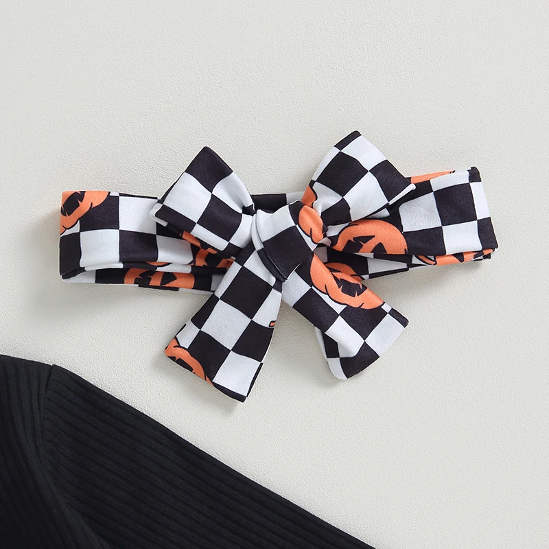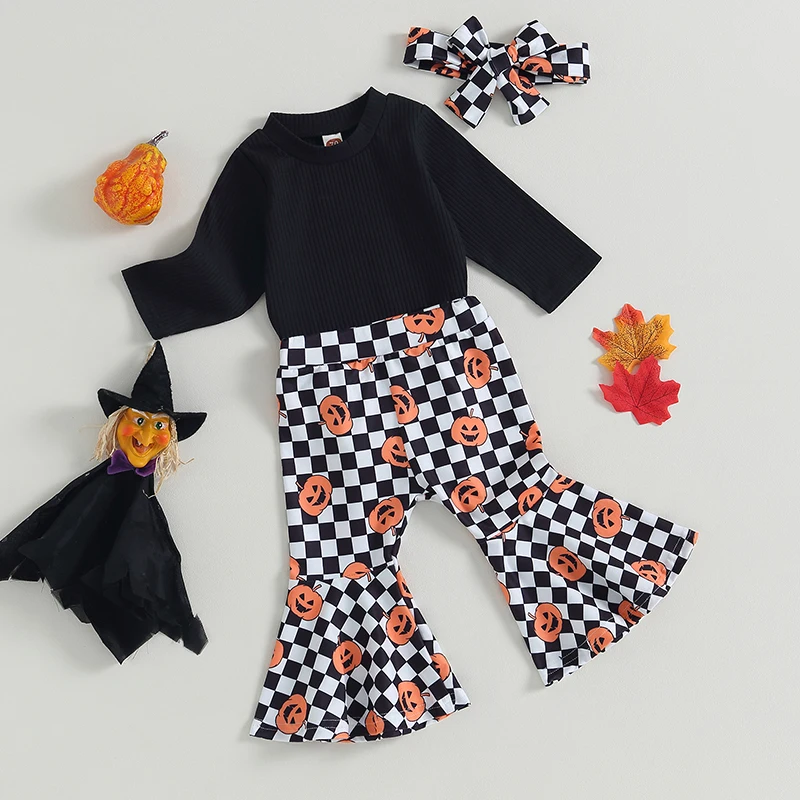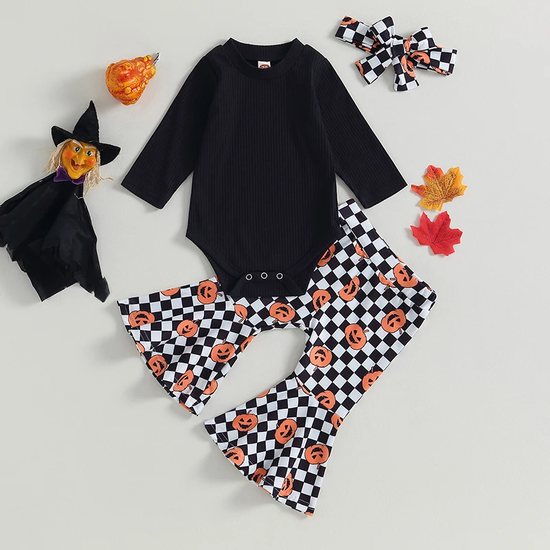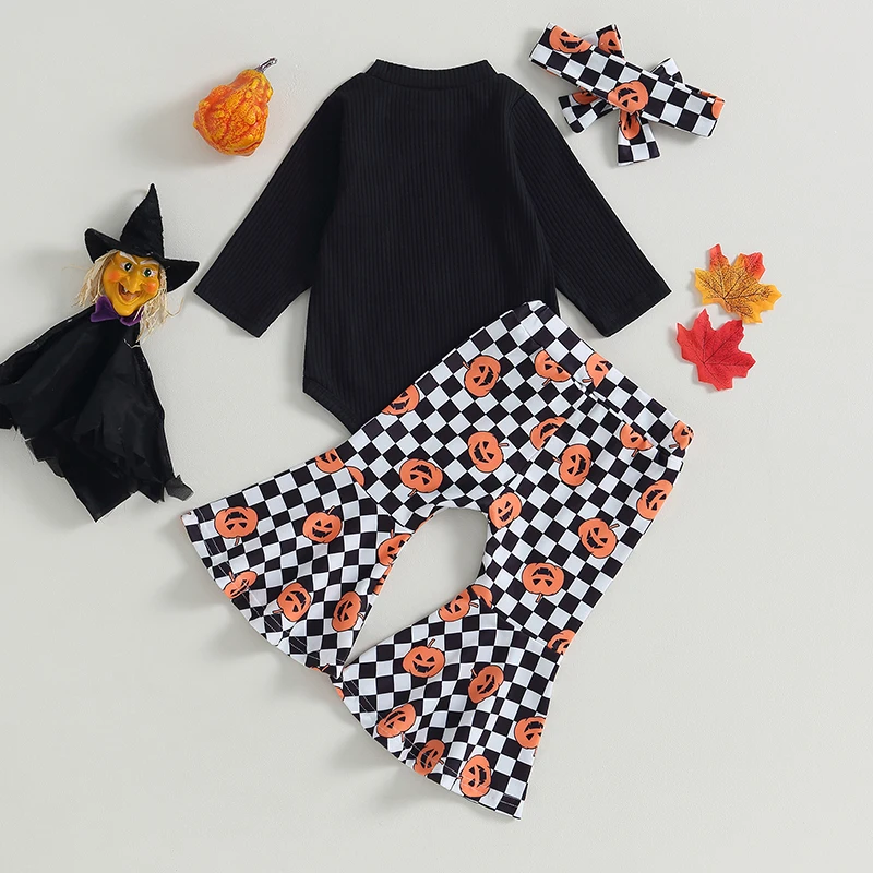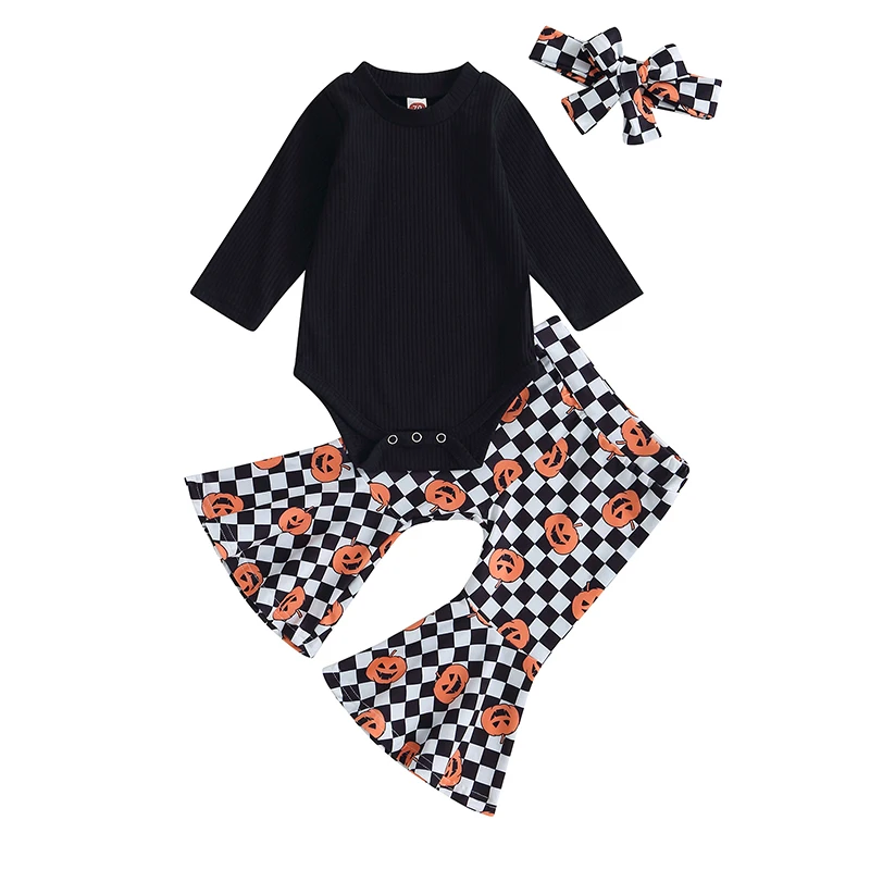 Baby Girl Fall Outfits Solid Color Long Sleeve Rompers Pumpkin Checkerboard Print Flare Pant Headband 3Pcs Halloween Clothes Set