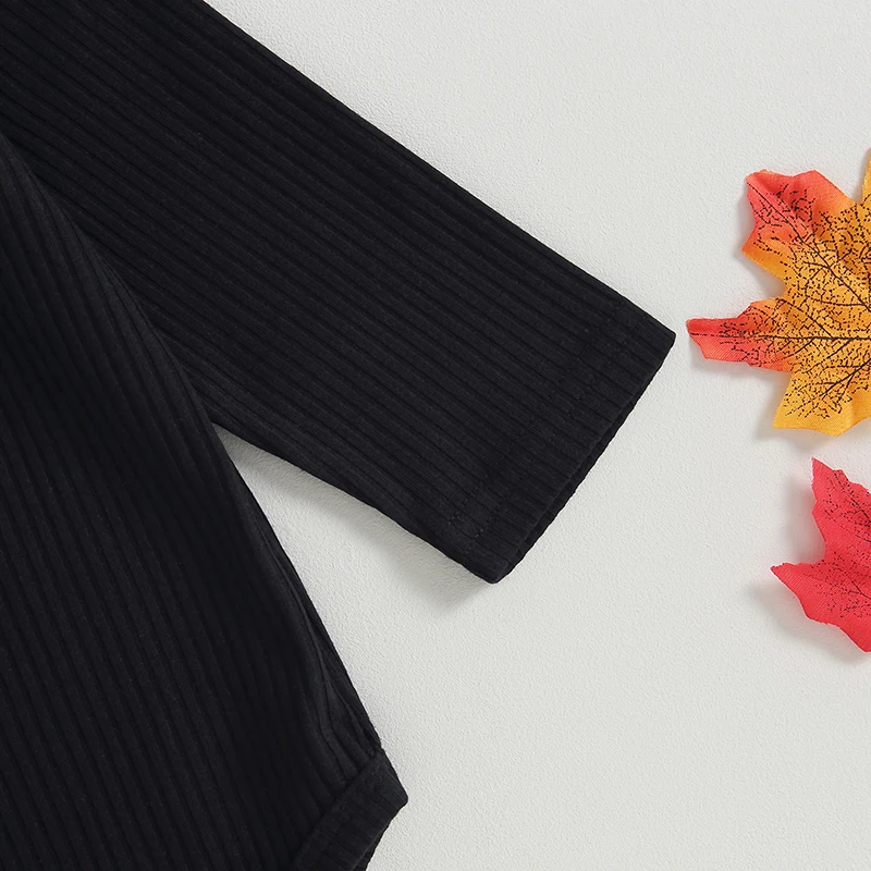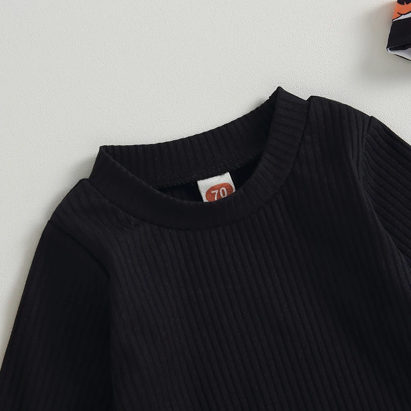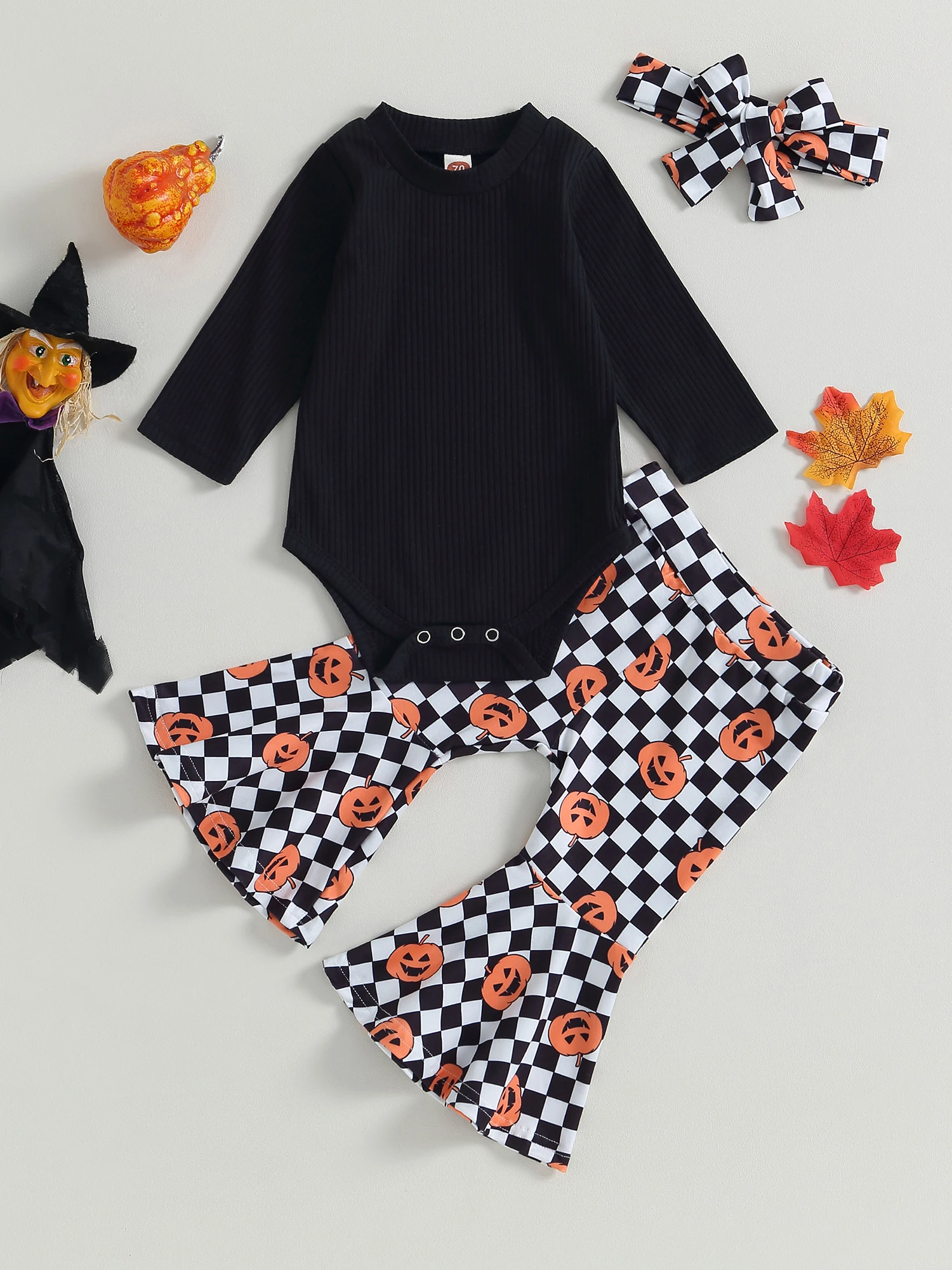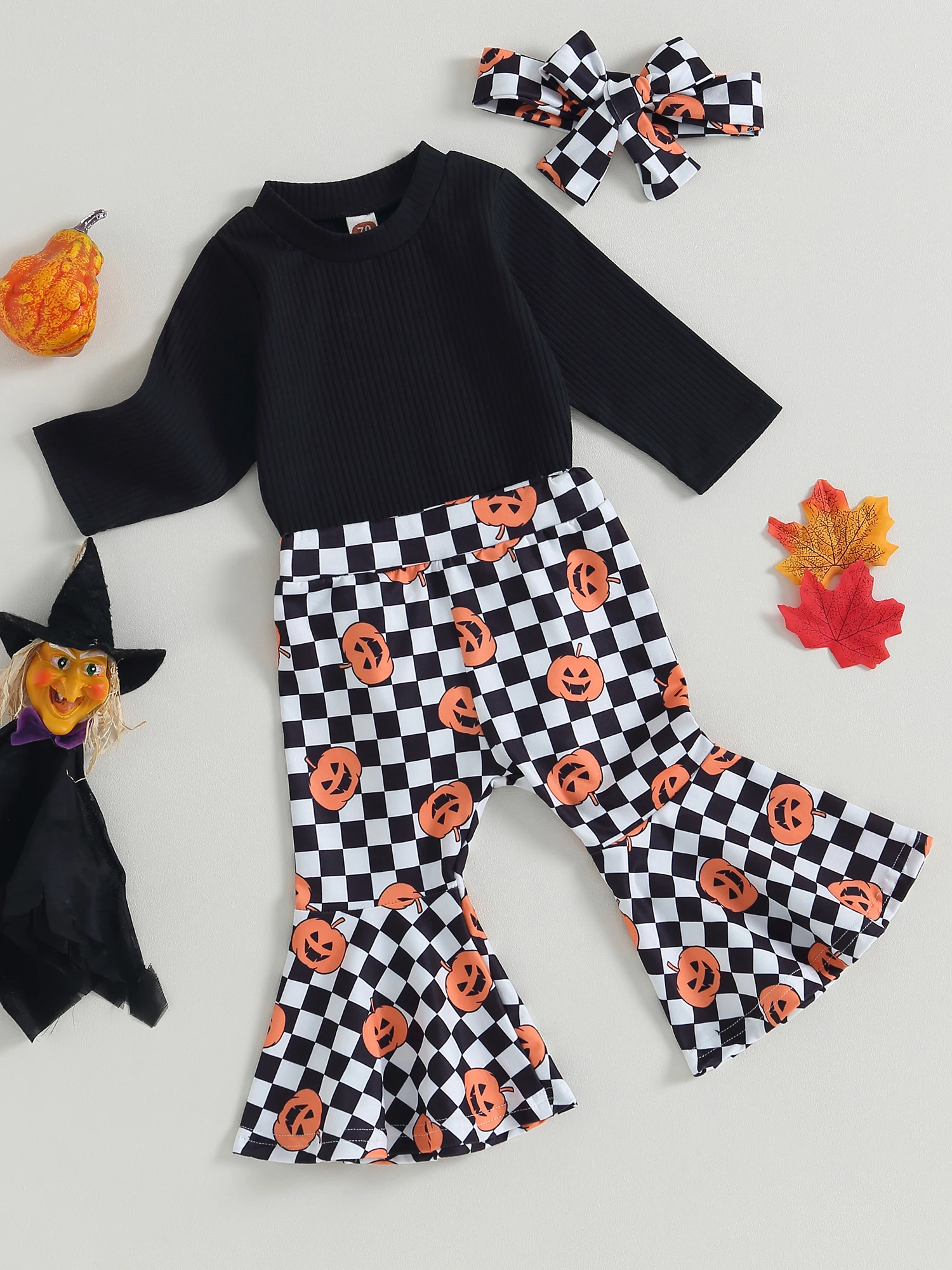 Baby Girl Fall Outfits Solid Color Long Sleeve Rompers Pumpkin Checkerboard Print Flare Pant Headband 3Pcs Halloween Clothes Set