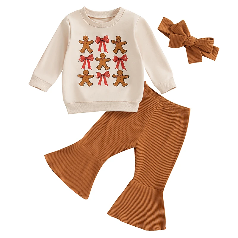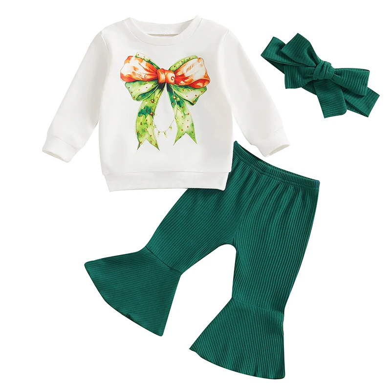 Toddler Girl Christmas Outfits Bow Print Long Sleeve Sweatshirt with Solid Ribbed Flare Pants Headband Set